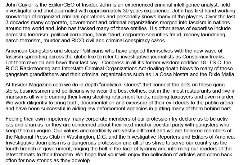 If you would like to support INSIDER-MAGAZINE.COM as an independent source of news and opinions -- Growing Stronger with a diversity of news, ideas and opinions guarding against dictatorship in America-- We would gladly accept your help via (VISA, Master Card, Discover.